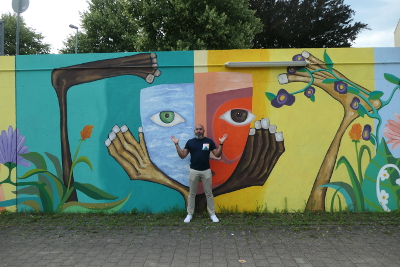 Hell- und dunkelhäutige Hände und Füße. Ein grünes Auge in einer himmelblauen Gesichtshälfte, ein braunes in der zweiten, roten, Hälfte. Mit diesen übergroßen Motiven präsentiert sich das nun fertig gestellte Mittelstück des Wandgemäldes im Hofbereich der Gewerbeschule Durlach. Entworfen hat es der Professor für Kunst und Soziokulturelle Studien Ernesto Farias Aparicio aus Kuba, gemalt haben es Schülerinnen und Schülern mit Migrationshintergrund aus der Gewerbeschule Durlach und aus der Schule am Turmberg unter seiner Anleitung. Finanziert wird das Projekt von den Arbeitsförderungsbetrieben gGmbH (Afb).